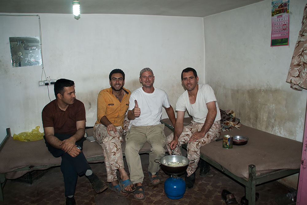 Es kam noch der 29jährige Dreher und ein junger Mechaniker hinzu, der die Arbeiten verrichten sollte. So fingen wir mitten in der Nacht zu fünft an, die Motorradhalterung wieder instand zu setzen. Es wurde geschraubt, geschweißt und geschliffen. Wir fanden eine Art der Verständigung und ein paar Stunden später war ausser dem Stoßdämpfer alles repariert. Jetzt konnte endlich gegessen werden und ich wurde natürlich herzlich dazu eingeladen. In der Kaschemme der beiden Soldaten ließen wir uns nieder und einer bereitete auf einem Campingkocher in einer alten, dreckigen ALU-Pfanne in Zwiebeln gebratene Geflügelleber zu.