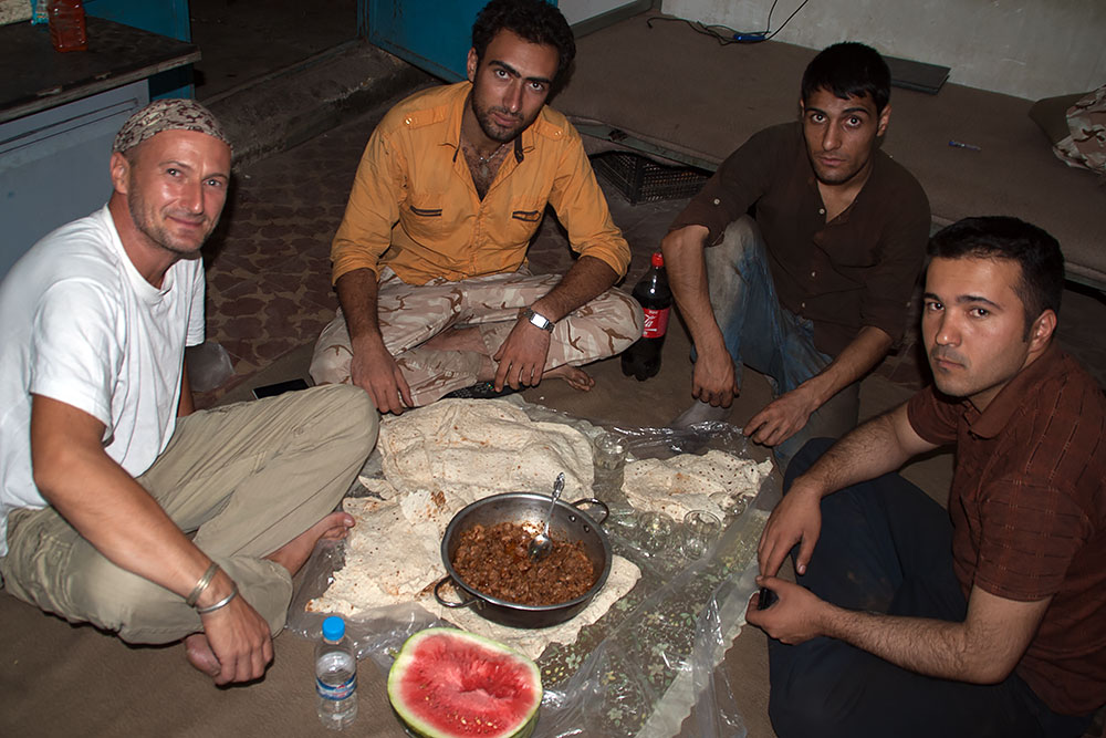 Eine Delikatesse, wie mir versichert wurde. Sie legten eine Decke auf den Boden, stellten die Pfanne in die Mitte und wir setzten uns in einer Runde (natürlich ohne Schuhe) darum. Dazu gab es sehr dünnes auf heißen Steinen gebackenes Fladenbrot „Lavash“. Jeder riss sich ein Stück davon ab, packte mit einem Löffel etwas aus der Pfanne darein, rollte das Ganze zusammen und aß es so. Zum Nachtisch gab es Melone.