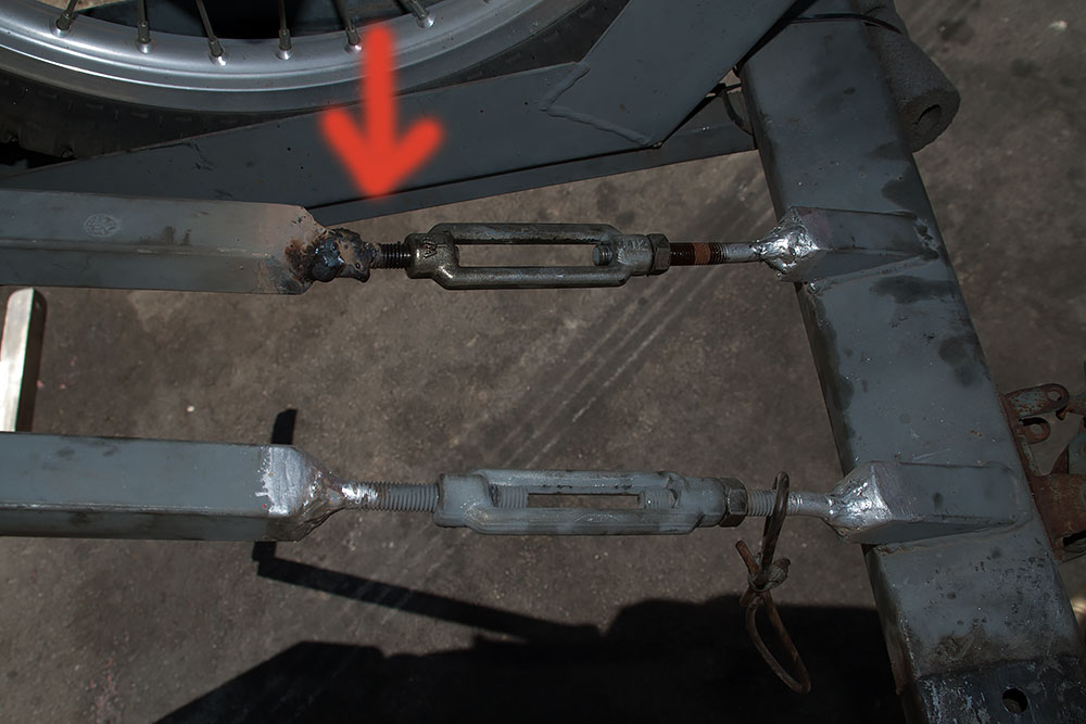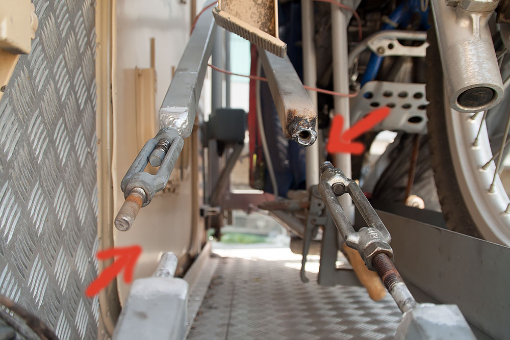Die neuen Schweißnähte an der Motorradhalterung hatten gehalten aber nun war ein Gewindebolzen (M12!) einfach mittig durch geschert!  Aber nicht nur das, auch die Befestigung am Fahrzeug war weggerissen (2 Schrauben M8) und der Stoßdämpfer, der im ausgeklappten Zustand verhindern sollte, dass die Halterung samt Motorrad bei Schräglage oder Wind einfach wieder an das Fahrzeug klappt, war völlig Schrott.