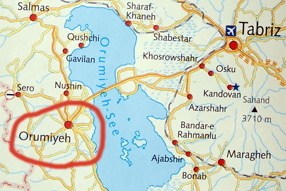 Wohin ich eigentlich fuhr wusste ich zu diesem Zeitpunkt ja noch nicht und mit der arabischen Schrift auf den Schildern konnte ich nur wenig etwas anfangen, bis ich auf einmal in lateinischer Schrift „Orumiyeh“ las. Dank meines Reiseführers vom Trescher Verlag wusste ich nun, dass ich mich die ganze Zeit auf den richtigen Weg befand und war etwas erleichtert. In der Stadt angekommen, war ich im Chaos. Meine Taktik, für mir unbekannte Städte ist immer erst einmal gerade aus zu fahren, nach Orientierung  zu suchen und im Notfall so wieder zurück zu finden. Und so fuhr ich drauf los. Den Fängern an der Grenze war ich entkommen und wollte lieber zu einem besseren Kurs, mein Geld in einer Stadt wechseln aber was heißt „Bank“ auf Arabisch und wie wird es geschrieben? Das Gekritzel an den Gebäuden liess nicht erkennen, was davon eine Bank war.