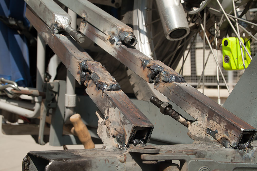 Nachdem er zwei Rohre aufgeschweißt hatte und wir die Halterung samt Susi aus der Befestigung am Koffer lösten, sackte diese um ganze fünf Zentimeter ab und passte so natürlich nicht mehr in die Befestigung. Er holte ein Rohr und hebelte damit die Halterung von Susi wieder hinein und schaute mich mit fragendem Blick an, so unter dem Motto: „Was hast Du denn? Es geht doch!“ Der Handlanger war schon dabei das Schweißgerät von der Strasse zu räumen und ich musste ihn dabei unterbrechen. „So kann das nicht bleiben!“ gab ich den beiden zu verstehen. Da Susi am Heck direkt vor die Eingangstür geklappt wurde, musste ich ja die Halterung auch ständig auf und zu klappen und wollte diese natürlich nicht jedes Mal mit einem Rohr in die Befestigung rein oder aus dieser raus hebeln.