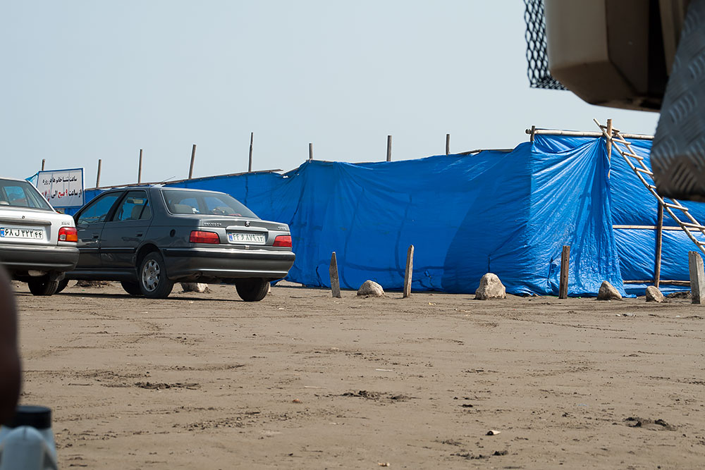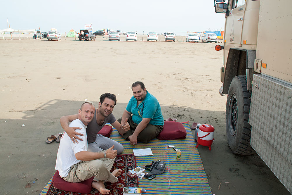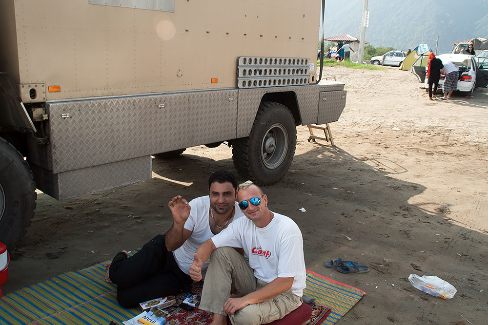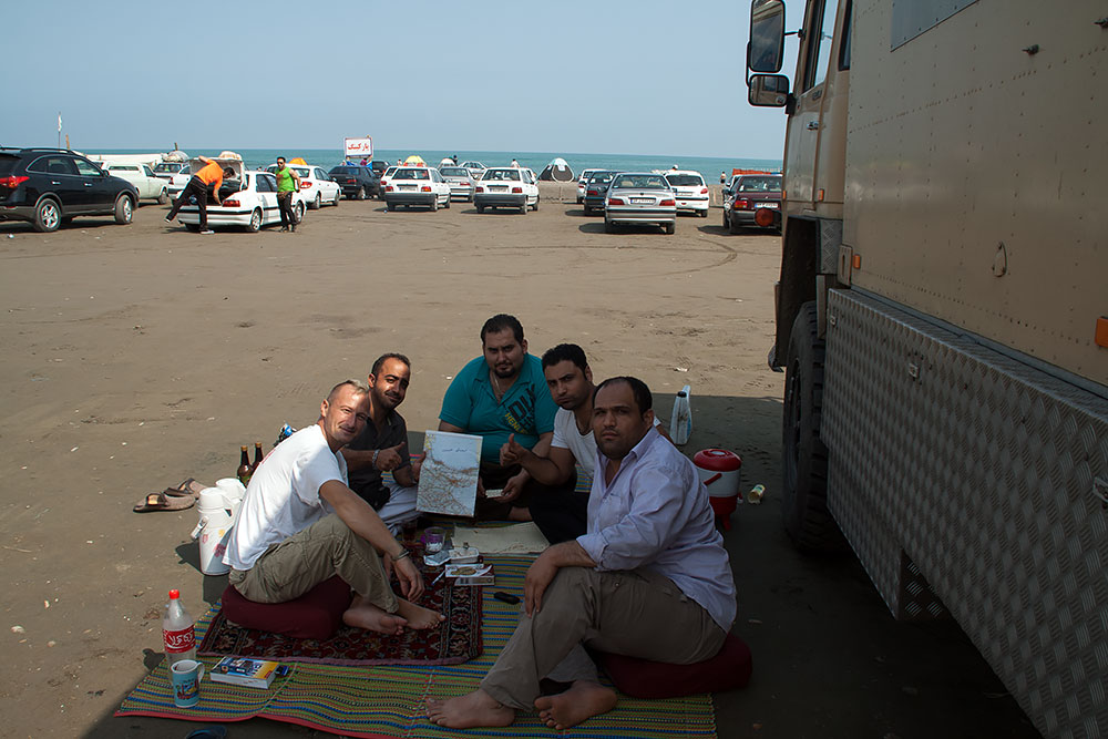 Ich fuhr in den Ort „Nur“ auf den Platz mit den Zelten und blickte um 23:34Uhr endlich auf das Kaspische Meer, das zur Begrüßung Wellen mit weißgeschmückter Krone auf den Strand warf. Mammut mit Sicht auf diesen geparkt, stieg ich aus und hatte gleich zwei Lächeln vor mir stehen. Das eine wollte Geld, das andere mich zum Tee einladen. So saß ich noch zwei Stunden mit drei Teheranern (zwei Brüder 25 und 33 plus einen Freund 28Jahre alt) auf einem Teppich, vor ihrem Kleinbus und versuchte mich wieder im Gespräch mit ihnen. Der jüngere von den Brüdern (der 25jährige) war als einziger von den dreien verheiratet. Er erklärte, dass er nichts vom Islam hielte aber sein Bruder um so mehr.