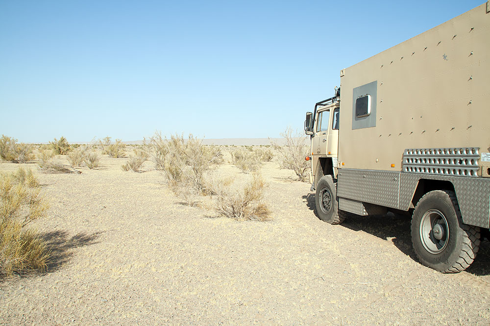 Rasool war schon eingetroffen und ich erzählte ihm von meinem Problem. Machte mich darauf sofort daran die Flüssigkeit aufzufüllen und begann die Leitung zu entlüften. Der Wiederstand baute sich auf und gleich wieder ab. Ich schaute unter Mammut und sah eine Pfütze. Meine Pulsader schwoll bedächtig an und ich machte mich mit dieser auf die Suche nach der Leckasche. Es war nichts zu finden, Mammut stand mit angekippter Kabine mitten im Weg und verlängerte meinen Aufenthalt noch einmal um einen Tag.