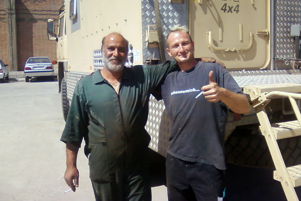 Zwei Geschäfte weiter fragte ich nach einer Strassenkarte vom Iran und man erklärte meinen Begleiter den Weg dorthin. Es war ein Kiosk und ich bekam eine Karte in arabischer Schrift! Na toll dachte ich, kaufte meiner Hilfe zum Dank noch eine Schachtel Zigaretten und machte mich wieder zurück zu Mammut. Dort wurde ich schon erwartet. Ein kleiner Mann in rotem Seidenhemd und Anzugshose, stand im Mafiosilook mit gespiegelter Sonnenbrille breitbeinig da. Er gab mir die Hand, begrüßte mich und erkundigte sich in sauberen Englisch nach meinem Befinden. Klappte sein Portemonnaie auf und zeigte mir seinen Dienstausweis: „Police“.