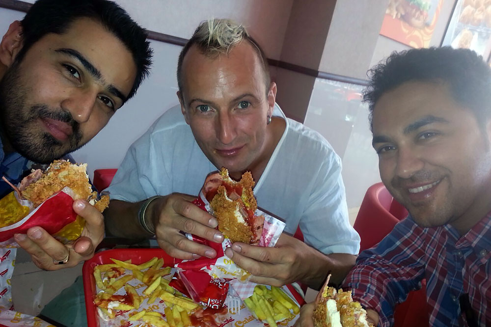 Am Samstag half er mir meine Wasserkanister zu füllen und mit Hilfe eines Gepäckwagens vom Flughafen über den großen Parkplatz zu rollen. Danach lud er mich ein, zusammen mit einem Freund von ihm, das neue American-Fast-Food-Lokal der Stadt zu testen. Das Menu im KFC wurde mir natürlich spendiert. Es kam der Sonntag und nicht irgend einer, sondern Freund und Taxifahrer Michael bekam die Aufgabe, mich zur chinesischen Botschaft zu fahren. Er sprach kein Wort Englisch, bekam aber von Rasool die klare Instruktion ihn sofort anzurufen, sollte ich weitere Wünsche haben, da er ihm dies dann übersetzen würde.