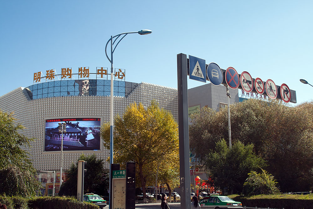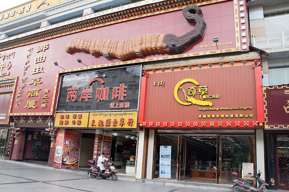 Kunst und Gebetskram. Dort herum sehr moderne Läden mit Glanz und