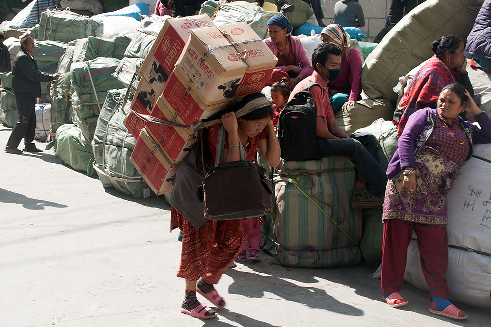 dutzenden LKW auf ihren Rücken über die Grenze (Brücke) zu tragen.
