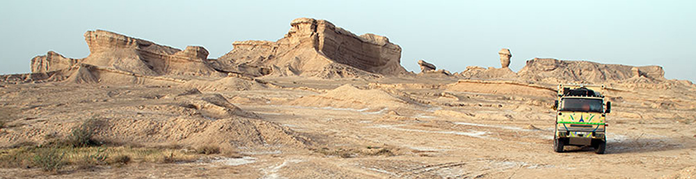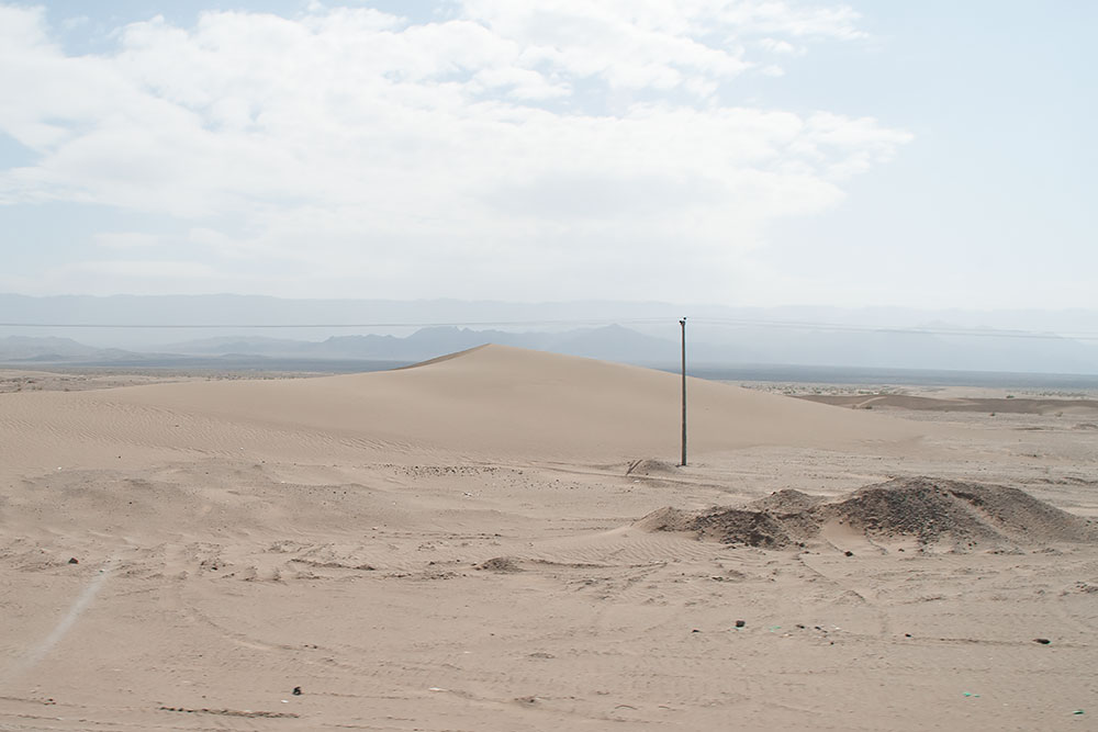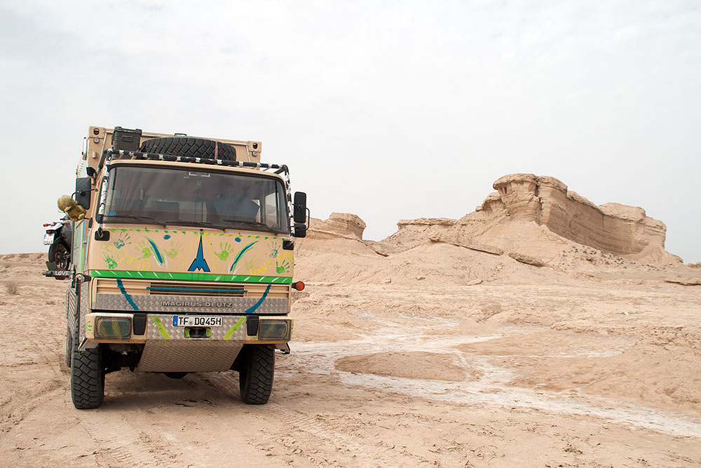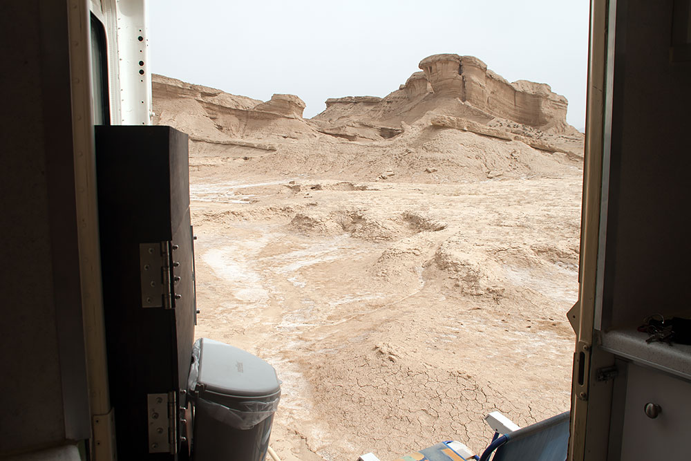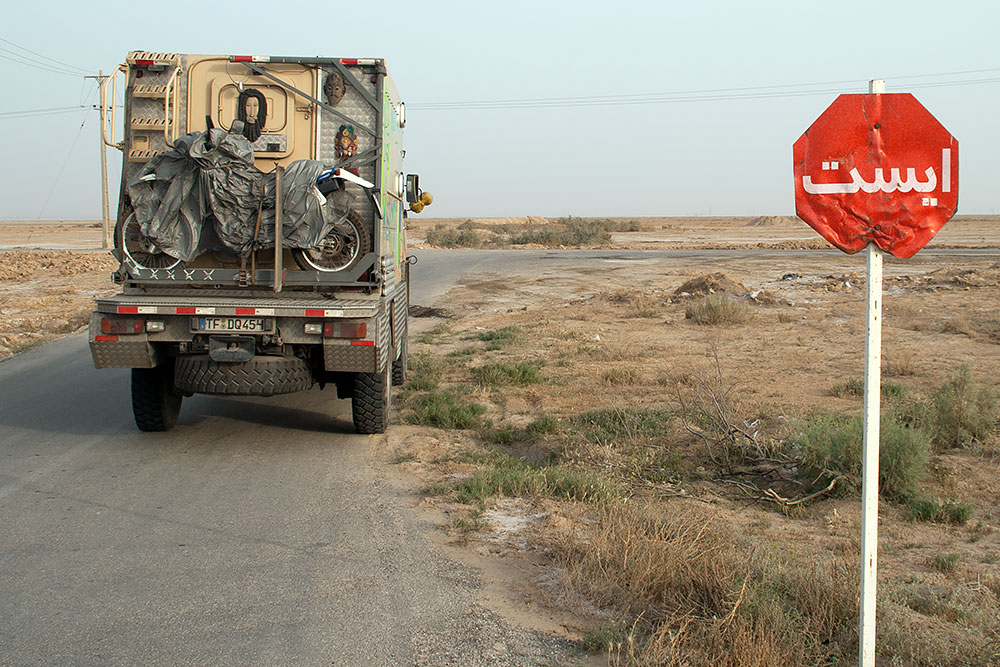 Es ist schwer wiederzugeben, es war einfach nervig und raubte Zeit. Am Ende hieß es, dass wir auch im Iran erst mit einem Geleitschutz zu reisen haben, der schon nach dem dritten Anlauf mit uns aus dem Grenzgelände herausfand (zwei Kamele auf einem Motorrad). Nun hiess es mal wieder Uhr umstellen und im Verkehr nach langer Zeit rechts einordnen. Doch nach ca. 20km war die Fahrt auch schon wieder vorbei und wir stoppten in der Wüste.