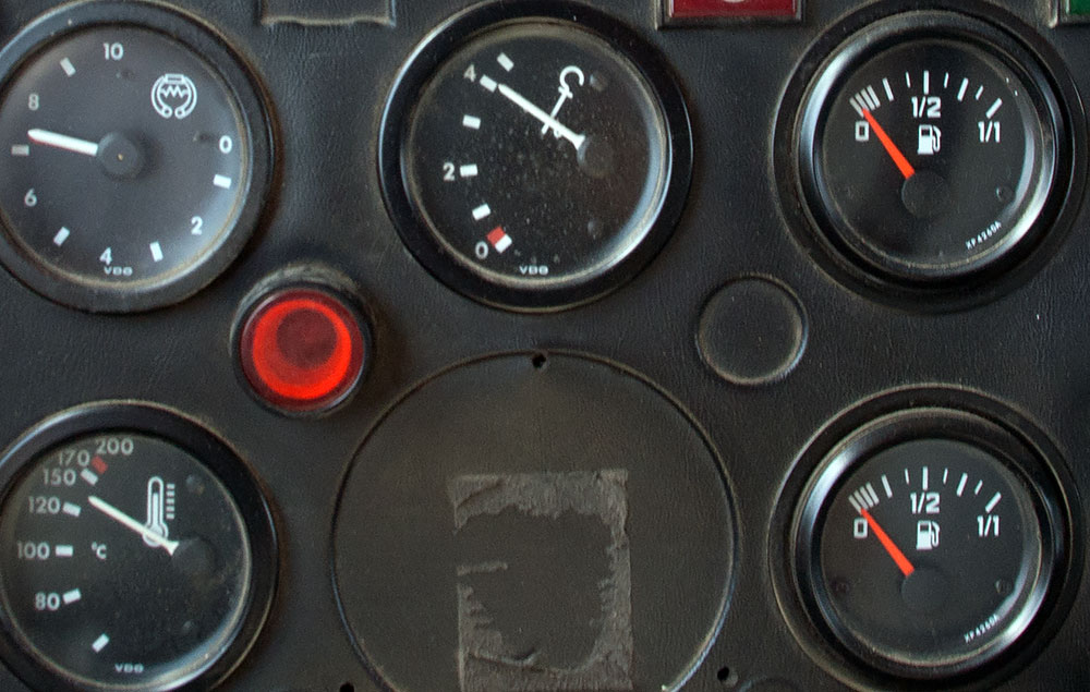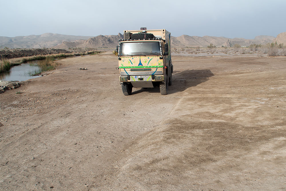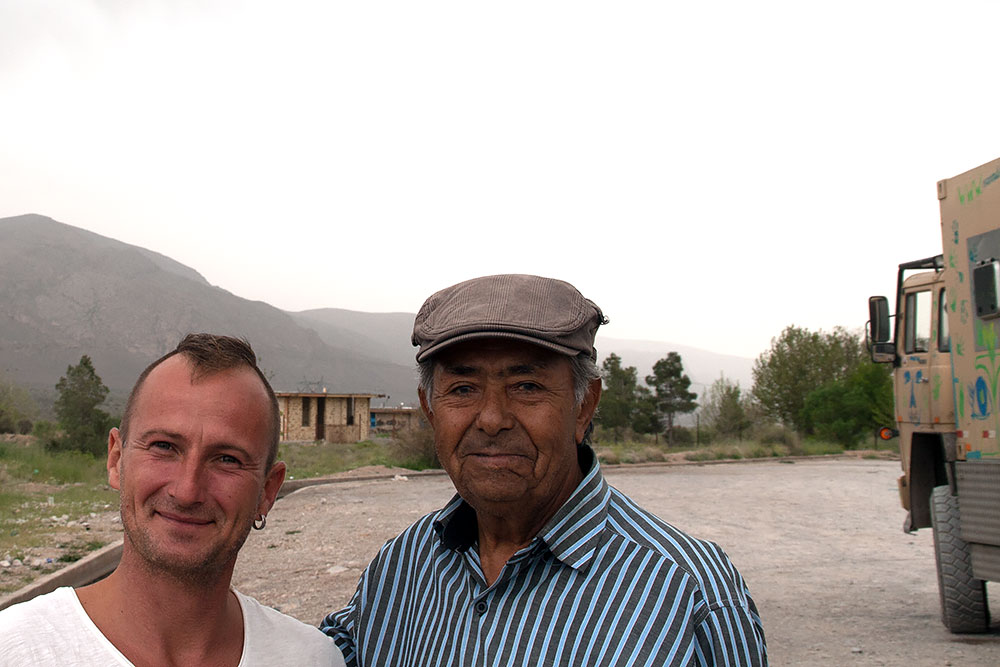 Um von Bam nach Bandar Abbas zu kommen, sind einige Berge zu bezwingen und dabei wurde der Motor von Mammut zu heiß, viel zu heiß (wie man oben auf dem Bild mit den Armaturen auch sehen kann). Auch funktionierte die Lichtmaschine für die Servicebatterien nicht mehr, dazu drückte noch Öl aus den Zylindern heraus, die Handbremse hatte wieder ihren Geist aufgegeben und es entwich Luft aus dem Leitungssystem. Das größte Problem war aber, dass im Iran gerade alle Leute zwei Wochen frei hatten und nur wenige noch ihrer Arbeit nachgingen. Der Obstmann half und so lernte ich Hadi kennen.