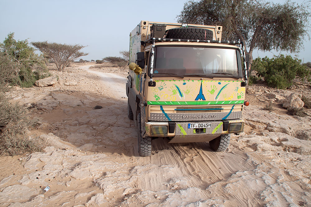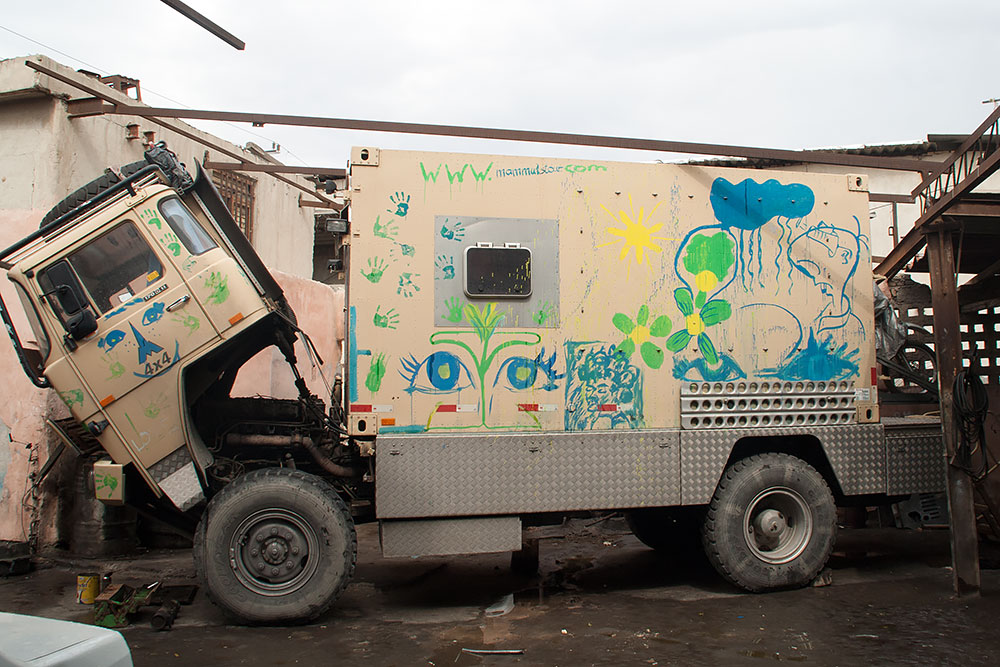 Stundenlang wurde danach an Mammuts Motor geschraubt und auch ein neuer Luftfilter montiert. Ich fettete währenddessen die Lager ab und wechselte das Öl von den Planetengetrieben an den Hinterrädern. Zu später Stunde war das Werk vollbracht und ich fuhr wieder durch die Stadt, zurück ans Meer.