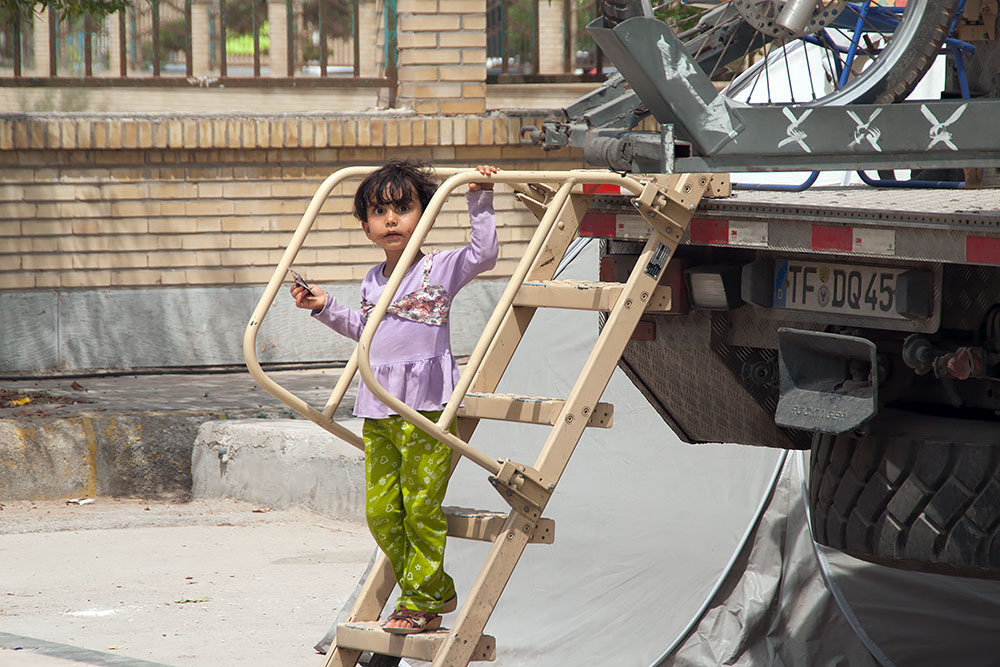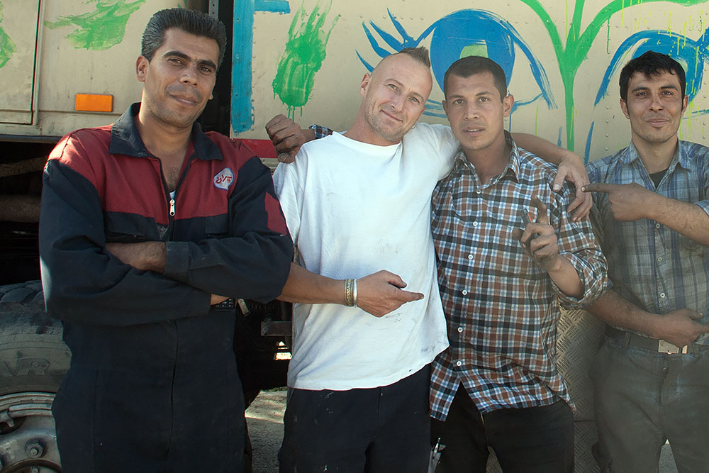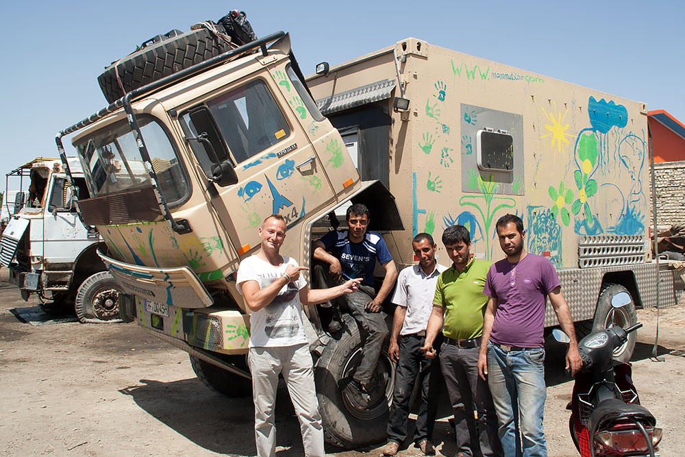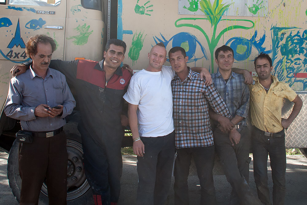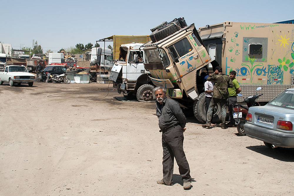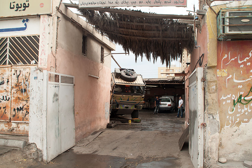 Nach nur zwei Polizeikontrollen und zwanzig Handybildern am Morgen, stand ich schon auf dem Gelände einer LKW-Werkstatt. Auch dort wurde ausser Persisch nichts anderes gesprochen. Nachdem sich die grosse Aufregung wegen des seltsamen Gastes gelegt hatte, konnte ich mit Händen und Füssen sowie Mimik die Reparaturliste klar machen.