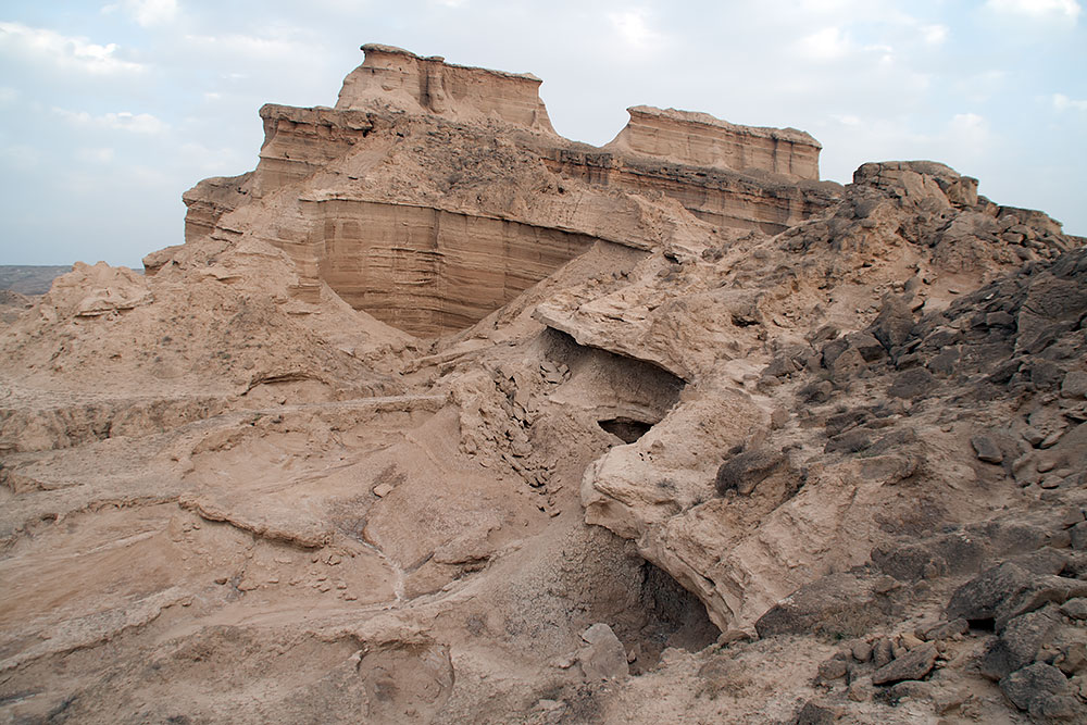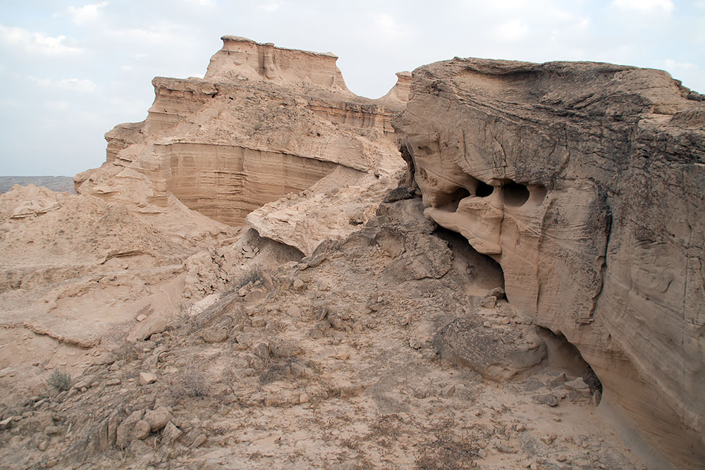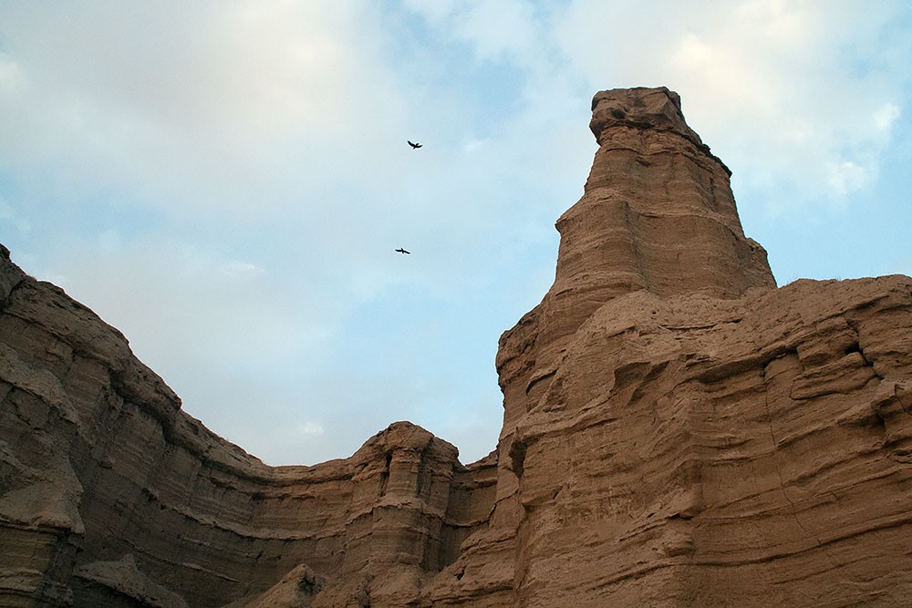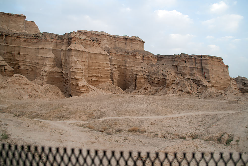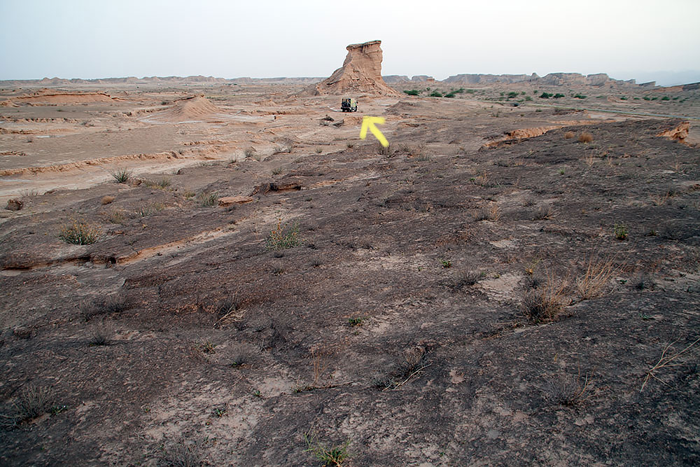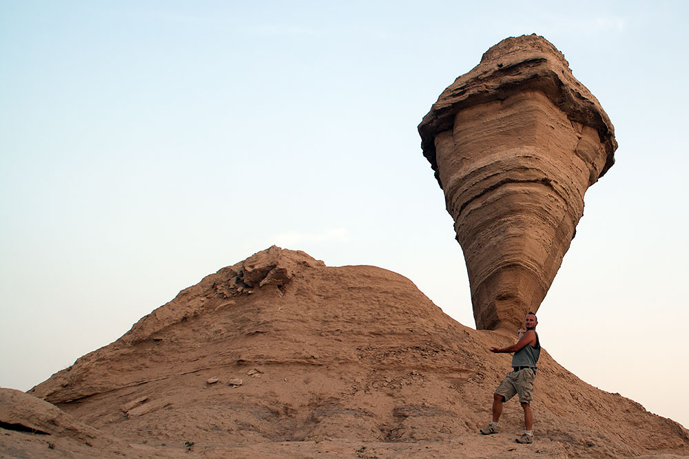 Schon in der Stadt Delvar angelangt blickte ich noch einmal auf eine Formation, die vom letzten Abendlicht beleuchtet, sich am Horizont erstreckte. Ich versuchte ihr näher zu kommen, um ein paar Fotos davon zu machen, fand aber keinen Weg durch die Stadt dorthin. Ein Mann auf seinem Motorrad sah mich mit dem Fotoapparat auf einer Anhöhe stehen und wusste sofort was ich wollte. Er fuhr voran und brachte mich offroad durch das Gelände zu den Felsen.
