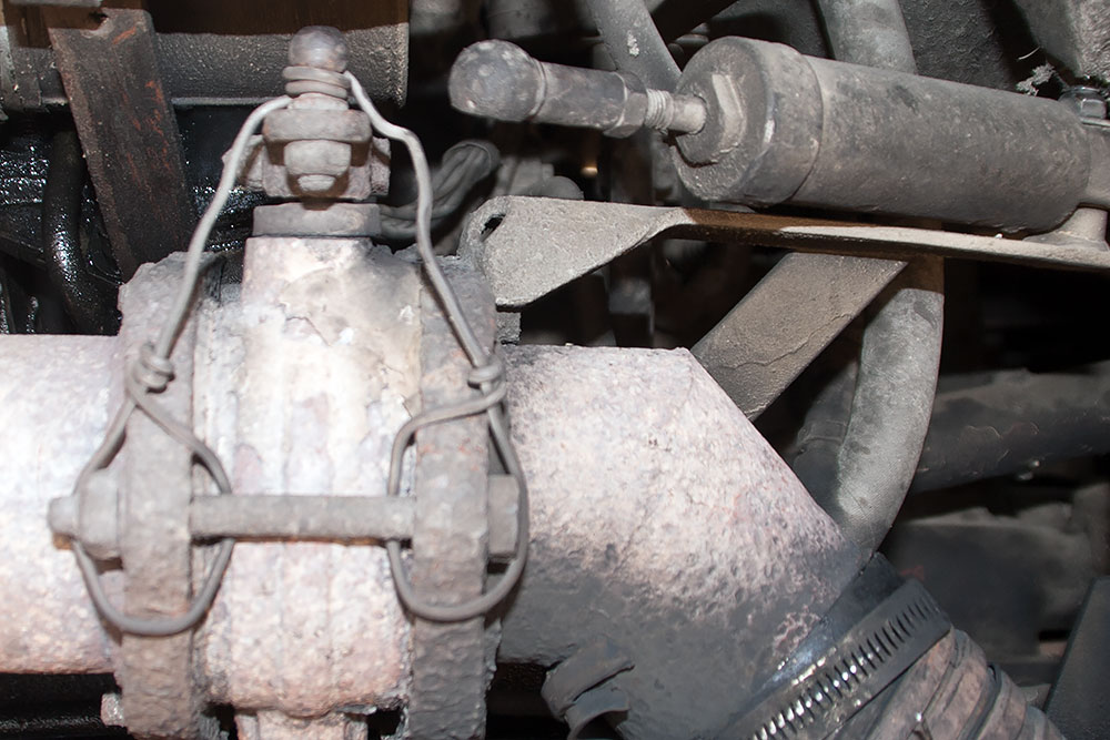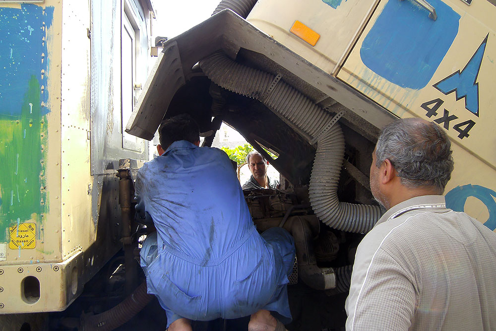 Der Motor lief tadellos, nur waren die Abgasklappen halb geschlossen. Es staute sich die Hitze und Mammut konnte seine 170Ps in der iranischen Hitze nie erreichen. Die Zylinder für die Klappen der Motorbremse liessen sich auch nicht weiter verstellen, waren werkseitig einfach ungünstig montiert worden, so dass sie nie ganz geöffnet waren. Also lösten sie die Zylinder auf beiden Seiten und fixierten die Klappen im geöffneten Zustand mit Drähten.