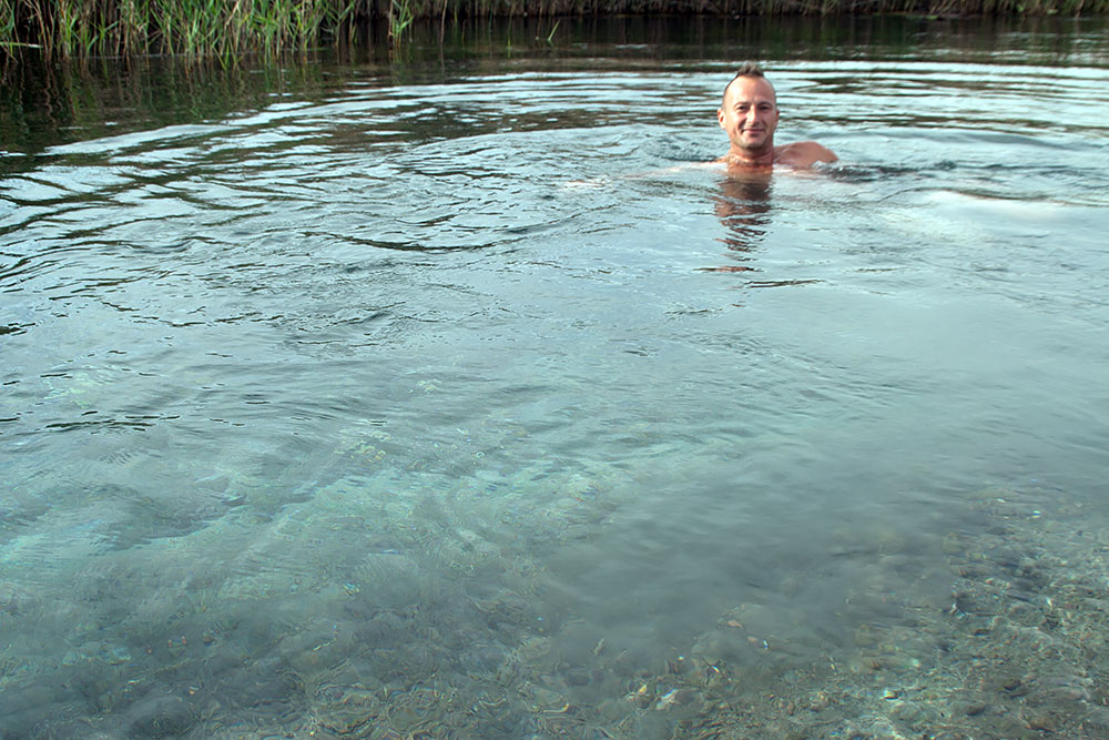 Es war ein lustiger Abend und erst am Morgen sah ich, dass sie mit dem schönen Platz nicht gelogen hatten und nahm gleich ein Bad in dem Graben.