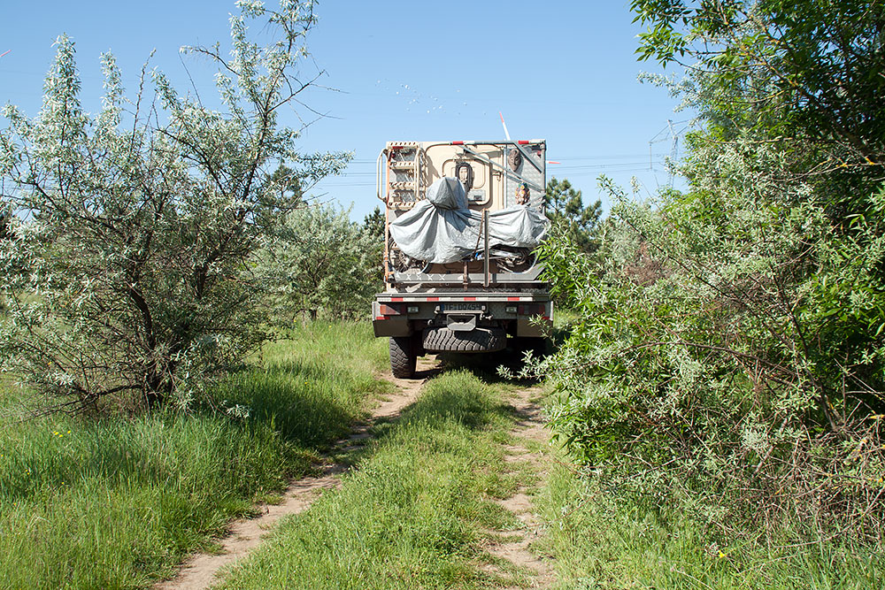 entlang automatisch die Grenze erreichen. Die einzige Strasse die ich Richtung Fluss fand, führte mitten in ein Industriegebiet. Es musste sich aber um Schwerindustrie handeln, denn von der Strasse war nicht mehr viel übrig. Nach einigen gequälten Kilometern und immer noch kein Fluss in Sicht, hielt ich an und stieg mit meiner Karte aus. Kurz darauf hielt neben mir ein kleiner PKW und ein Mann fragte mich etwas, was ich nicht verstand. Ich sagte darauf: „Ukraine“ und er antwortete: „da da, dawei dawei“ und zeigte mit seiner Hand die Strasse hinunter. Auf dem Bild unten ist sein PKW noch ganz klein zu sehen und ich dachte nur bei mir, der verarscht dich doch! Aber nein! Tatsächlich führte dieser Weg direkt zum Grenzübergang in ca. 15km. Kein Schild, nicht ein winzig kleiner Hinweis, war dafür zu finden. |